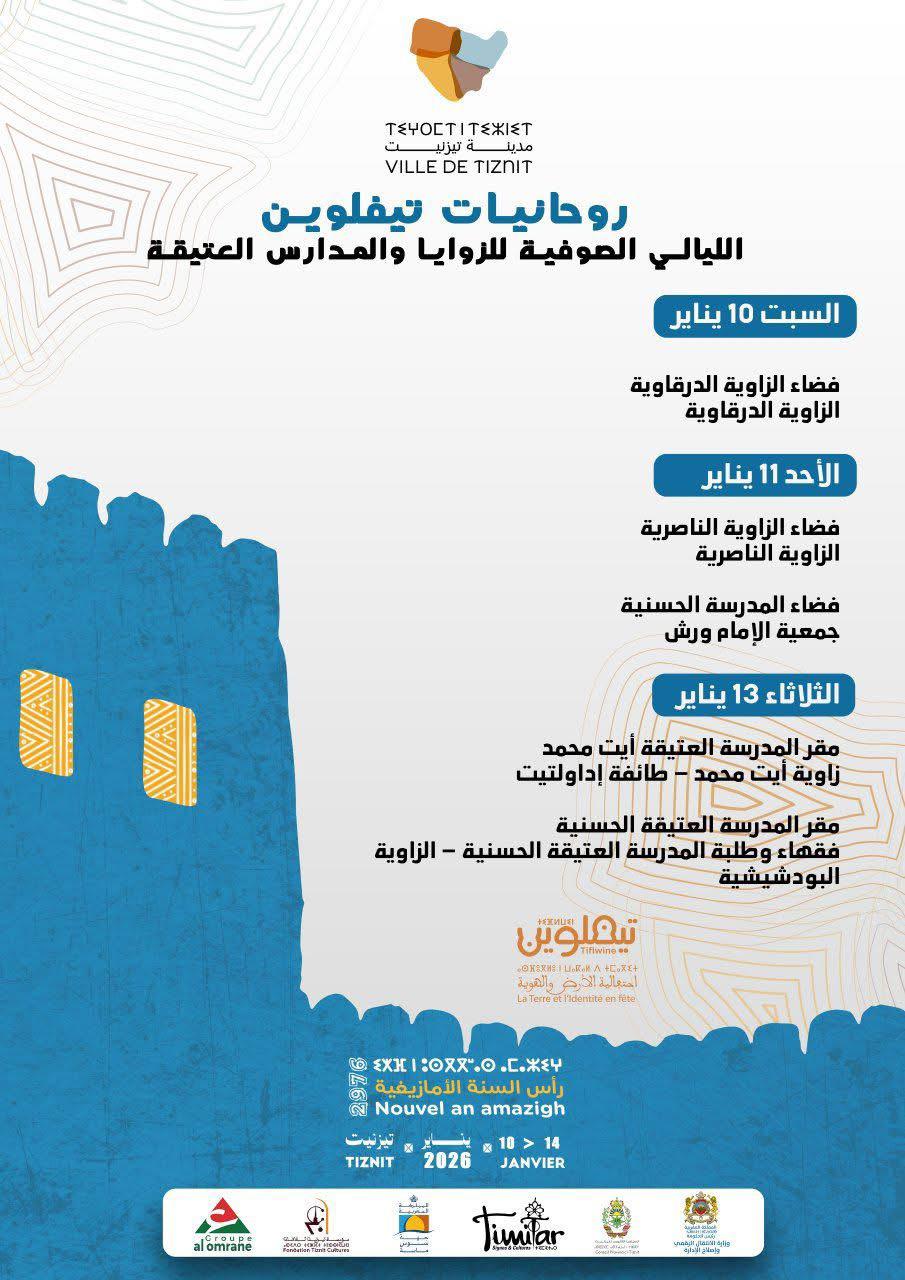 في سياق تخليد رأس السنة الأمازيغية «إيض ن يناير»، تستعد تيزنيت لاحتضان دورة جديدة من تظاهرة «تيفلوين»، خلال الفترة الممتدة من 10 إلى 14 يناير 2026، وذلك بمبادرة من جماعة تيزنيت وبتعاون مع مختلف الفاعلين المحليين وشركائها المؤسساتيين والمدنيين.