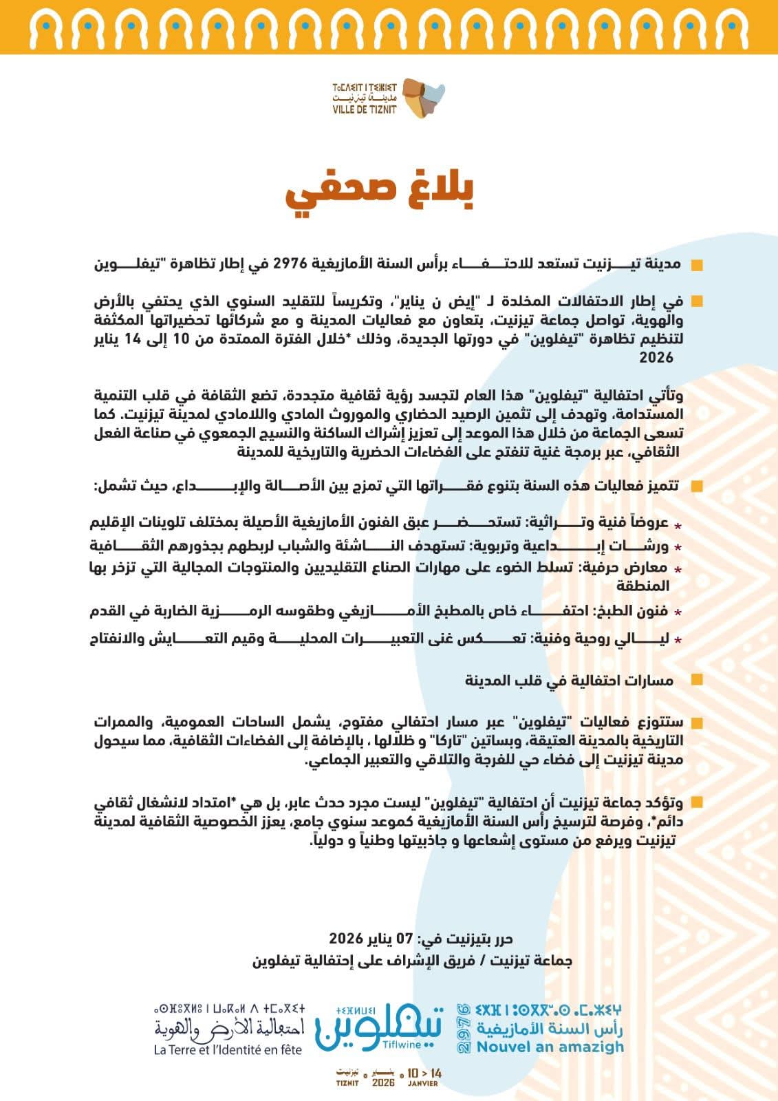 وأكدت جماعة تيزنيت، في هذا السياق، أن «تيفلوين» ليست مجرد تظاهرة ظرفية، بل تشكل امتداداً لانشغال ثقافي مستدام، يهدف إلى ترسيخ رأس السنة الأمازيغية كموعد سنوي جامع، وتعزيز إشعاع المدينة الثقافي والسياحي، ورفع جاذبيتها على المستويين الوطني والدولي.