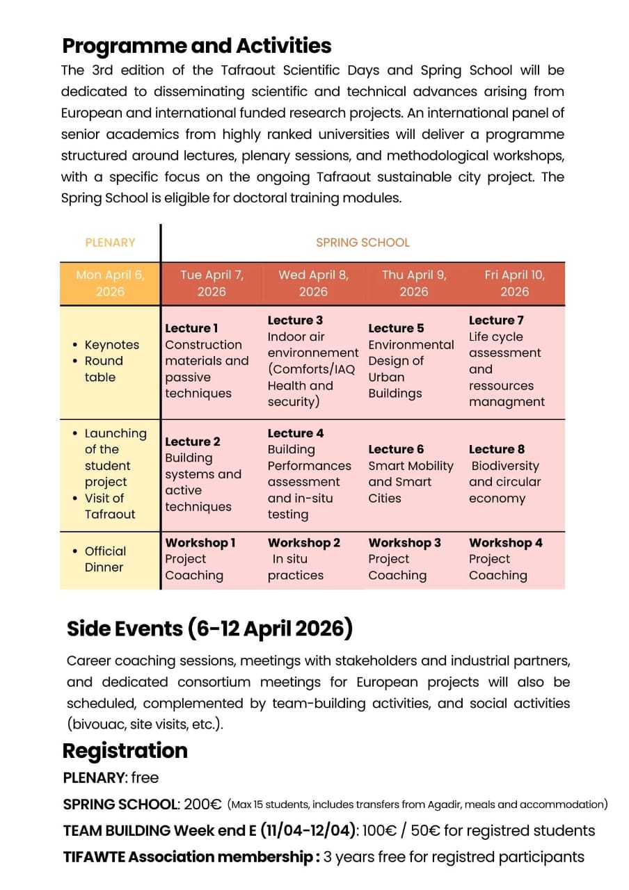 وتهدف هذه الدورة إلى نشر وتبادل آخر المستجدات العلمية والتقنية الناتجة عن مشاريع بحثية ممولة من طرف الاتحاد الأوروبي وشركاء دوليين، بما يتيح فضاء لتقاسم الخبرات وتعزيز التعاون الأكاديمي الدولي. ويرتقب أن تعرف هذه التظاهرة مشاركة أساتذة جامعيين وباحثين من جامعات دولية مصنفة، سيؤطرون برنامجا علميا متكاملا يشمل محاضرات علمية، وجلسات عامة، وورشات منهجية موجهة بالأساس لطلبة سلك الدكتوراه والباحثين الشباب.