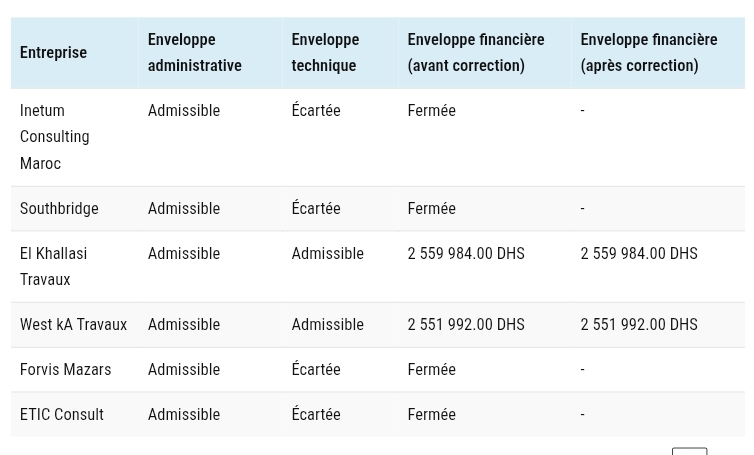 وتشير المعطيات المالية إلى أن العروض المقبولة كانت متقاربة بشكل لافت، حيث بلغ عرض شركة El Khallasi Travaux مبلغ 2.559.984,00 درهم، فيما بلغ عرض West KA Travaux Générale بعد التصحيح 2.551.992,00 درهم، أي بفارق يقل عن 0,3%. وتعتبر هذه النسبة غير معتادة في مثل هذه الدراسات التي عادة ما يظهر فيها تفاوت أكبر في الكلفة نتيجة اختلاف البنية التكوينية للفرق التقنية وعدد الخبراء والموارد المخصصة.