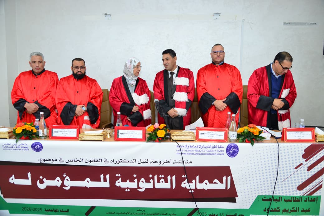 وفي ختام المناقشة، نوهت لجنة المناقشة بالقيمة العلمية والعملية للأطروحة، وبالمنهجية المعتمدة وعمق التحليل، معتبرة أن البحث يشكل إضافة نوعية لحقل القانون الخاص وقانون التأمينات، لتعلن منح الطالب الباحث عبد الكريم كعدود شهادة الدكتوراة في القانون الخاص بميزة مشرف جدا.